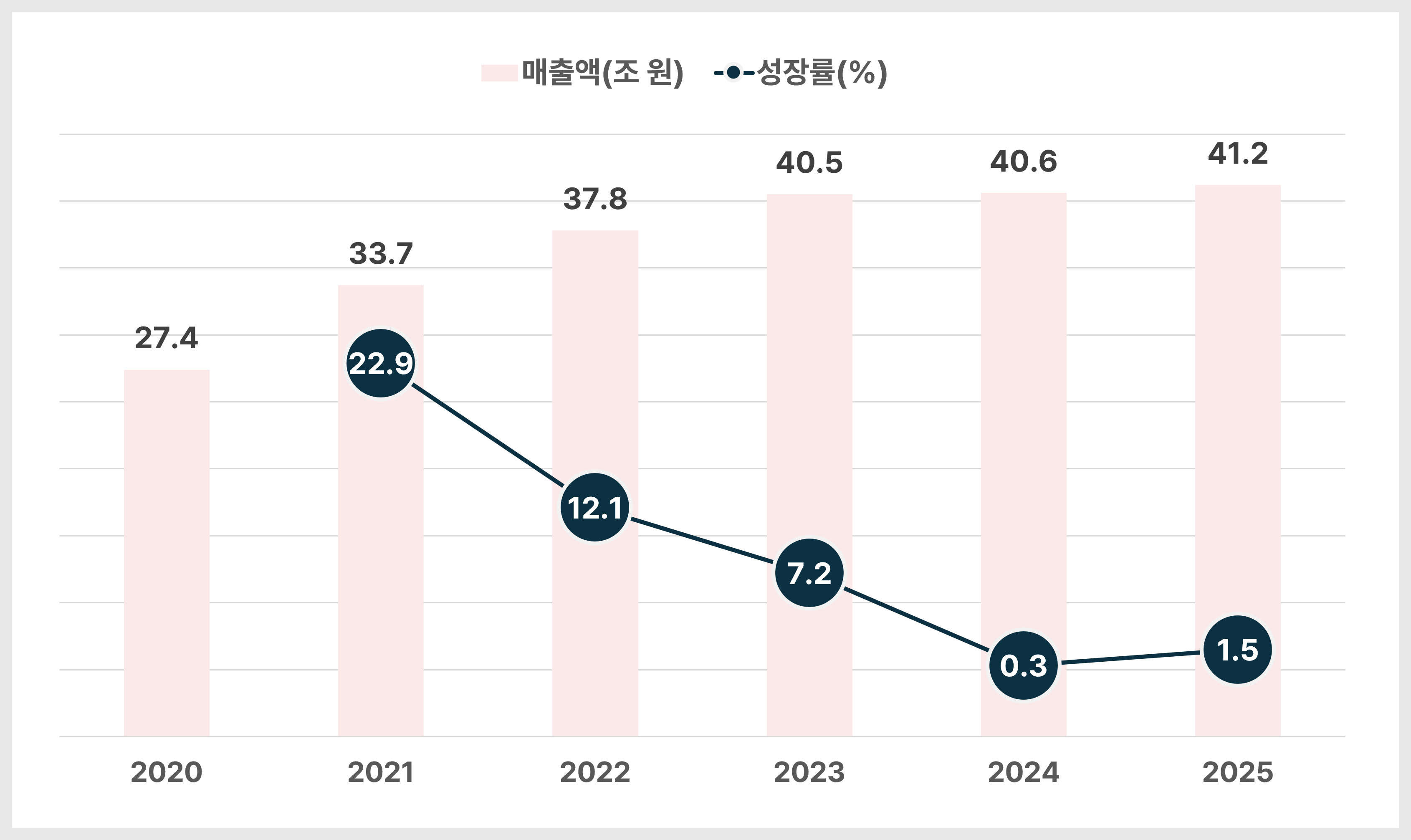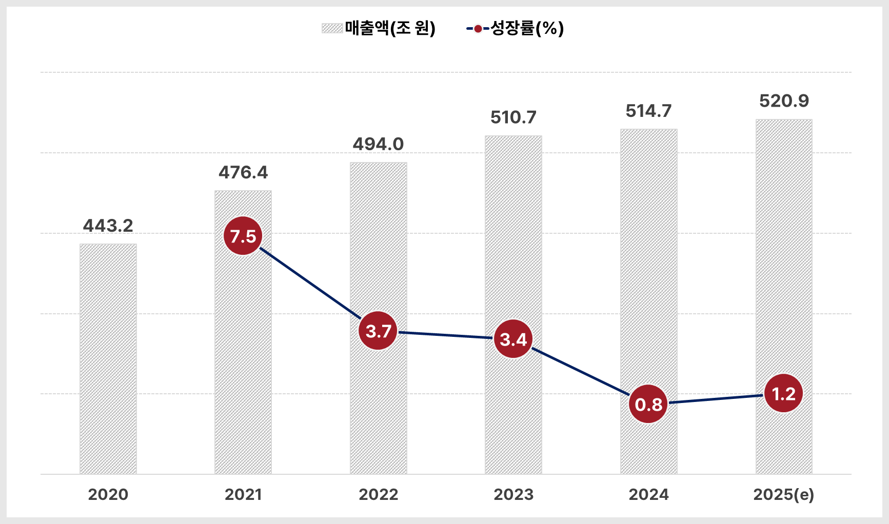 2025년 국내 소매시장 규모는 전년 대비 1.2% 성장한 약 521조 원으로 추정됩니다(통계청 ‘소매판매액’ 기준). 상반기 소비시장은 경기침체와 고물가, 대내외 정세 불안이 겹치며 소비심리가 극도로 냉각됐고, 성장률은 0.1%에 머물렀습니다(그림 1 참고). 다행히 하반기 들어 일부 불안 요인이 해소되고 민생회복소비쿠폰 지급 효과가 더해지면서 소비심리는 다소 회복세를 보였고, 그 결과 7~10월 소매판매액이 2.5% 증가하며 연간 성장률을 끌어올렸습니다.