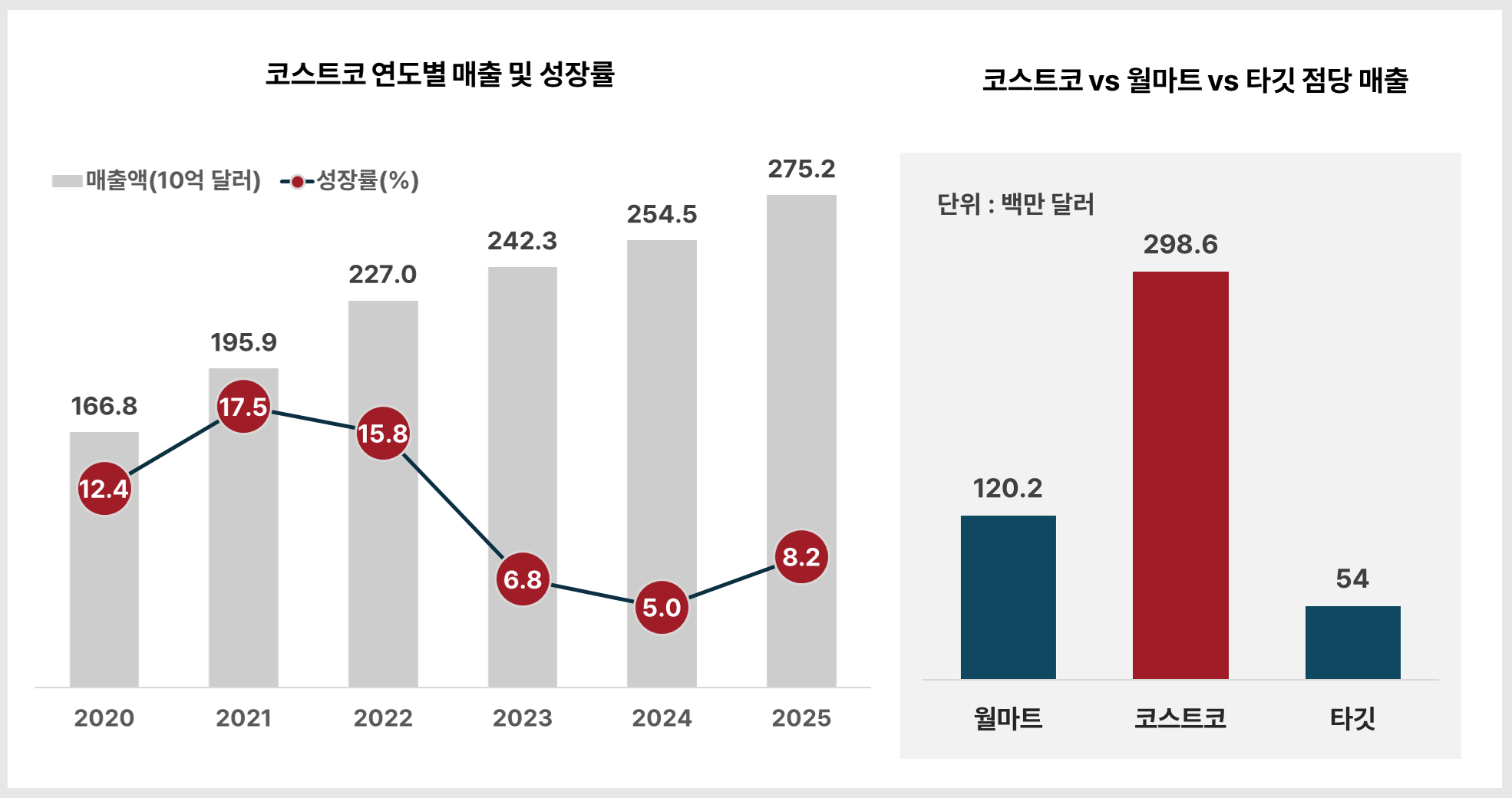 국내 소매시장은 2024년에 이어 올해도 물가성장률을 밑도는 성장률을 기록했습니다. 이러한 시장 정체는 우리나라뿐 아니라 미국, 유럽, 일본 등 주요국 소매업계에서도 공통적으로 나타나는 현상인데요. '2026 유통산업 전망 세미나'의 기조연설을 맡은 BCG코리아 안태희 MD파트너는 최근 글로벌 소매업계를 관통하는 핵심 소비트렌드를 세 가지로 정리했습니다. 안 파트너는 글로벌 소비시장에서 포착되는 중요한 변화로 먼저 '모든 소비자가 밸류쇼퍼로 전환되고 있다'는 점을 꼽았습니다. 소득 수준이나 지불 여력과 관계없이 이제 소비자들은 가격대비 가치, 즉 '가성비(value for money)'를 충족시키는 곳에만 지출하는 구매패턴이 강해지고 있습니다. 이로 인해 차별화된 가치를 제공하지 못하고, 가격 경쟁력도 확보하지 못한 오프라인 유통업체들은 시장에서 밀려나며 구조조정 압력에 직면하게 됐죠. 그 결과 나타난 현상이 바로 두 번째 트렌드인 '오프라인 포맷의 양극화'입니다. 양극화를 이루는 두 축은 '경험'과 '가격 경쟁력'이에요. 즉, 차별화된 콘텐츠나 서비스를 제공하는 경험 우위형(experiential) 매장이거나 압도적인 가격 경쟁력을 갖추고 고회전 기반의 효율을 극대화한 매장(transactional)만이 소비자의 선택을 받고 있는데요. 트랜잭셔널 포맷을 지향하는 대표적인 사례가 코스트코입니다. 회원제 창고형 매장의 효시인 코스트코는 4천여 개로 압축된 상품구색을 가져가면서 고품질, 저마진 전략으로 지속성장을 실현하고 있는 소매기업으로, 점포당 매출액이 월마트의 2.5배, 타깃의 5.5배에 이릅니다(그림 2 참고).