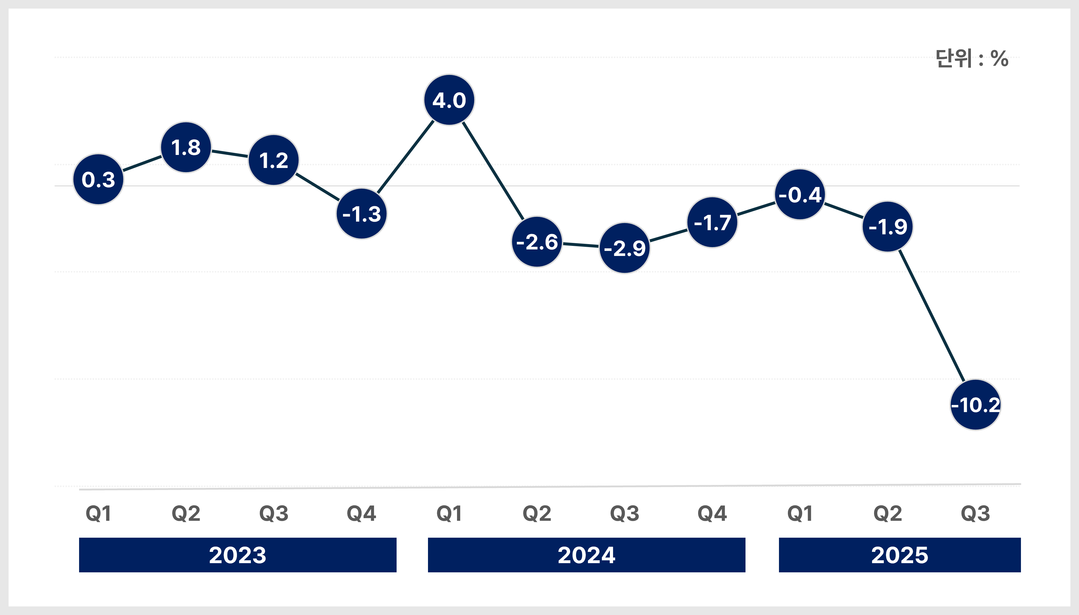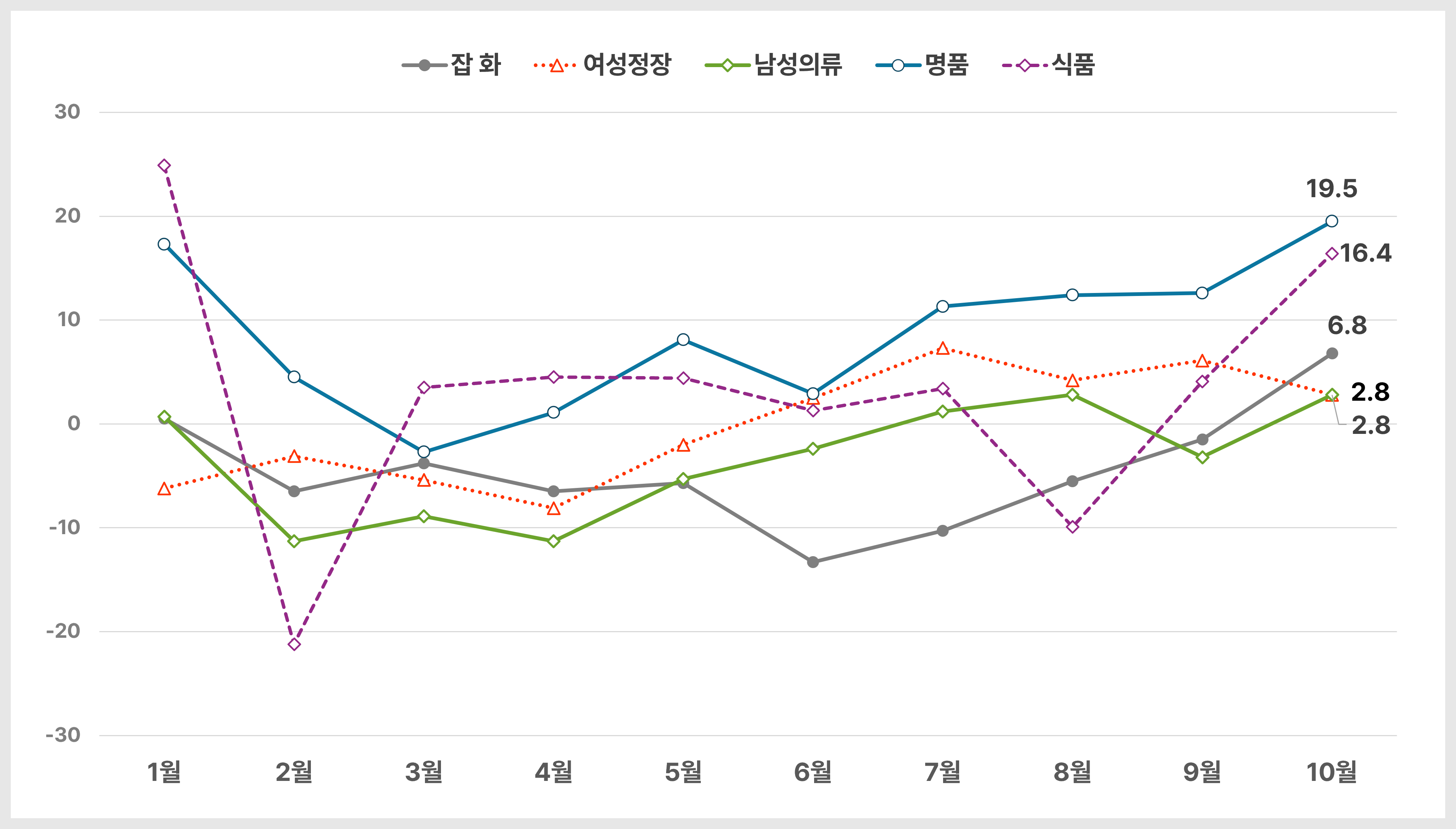 특히 명품과 여성정장 매출의 회복세가 두드러졌습니다. 백화점 3사의 월별 카테고리 성장률을 살펴보면, 해외 유명 브랜드, 즉 명품 매출은 3월을 제외한 모든 달에서 플러스 성장을 기록했어요. 또한 2024년 내내 역성장했던 여성의류도 올해 하반기에는 플러스 성장으로 전환되며, 백화점 분위기가 개선되는 데 기여했습니다. 단, 잡화 카테고리는 2~9월 연속 마이너스 성장을 기록하며, 온라인 대비 카테고리 경쟁력이 약화된 모습을 드러냈어요.