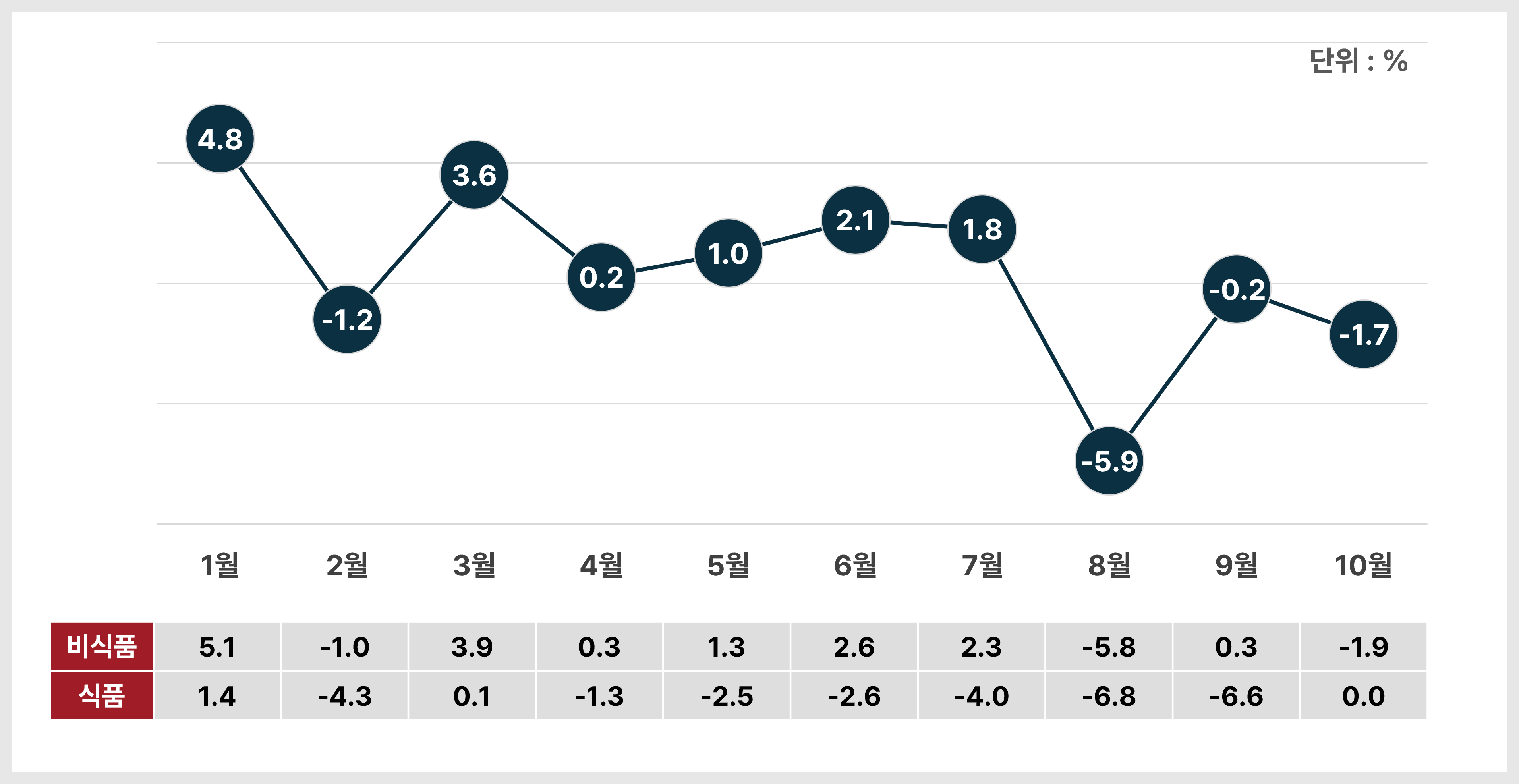 전체 대형마트 시장은 올해 역성장이 예상됩니다. 백화점·편의점·온라인쇼핑몰이 상반기 대비 하반기 실적이 개선된 것과 달리, 대형마트는 하반기 들어 더 큰 부진을 겪었는데요. 1~2인 가구 증가에 따른 대형점 이용 감소, 온라인 채널로의 이동 등 기존 요인 외에도 3월부터 기업회생 절차에 돌입한 홈플러스 사태, 6월 이후 지급된 민생회복소비쿠폰 사용처 제외 등 악재가 겹치며, 힘겨운 한 해를 보냈습니다.